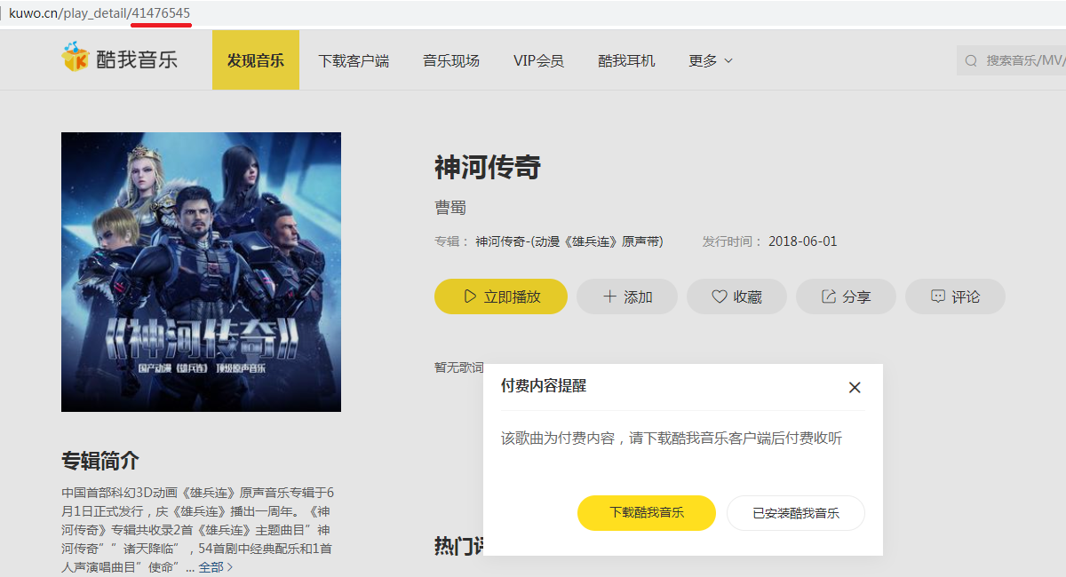 下面以付费音乐为例,下图中可以清楚的看到是付费音乐,其中红线部分是音乐id。