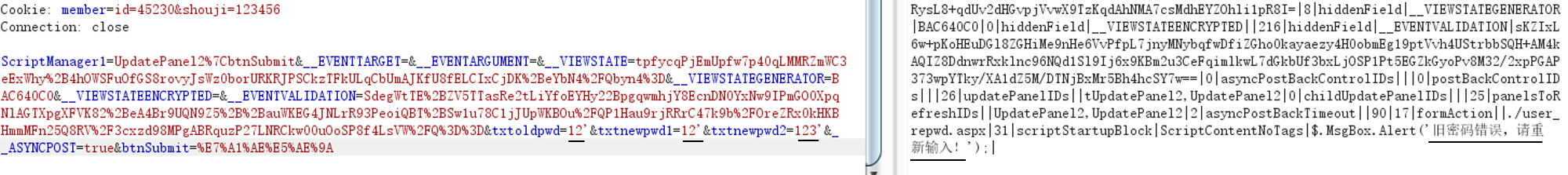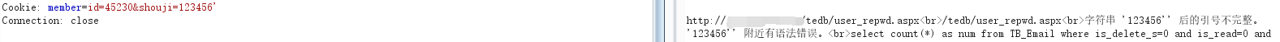 难道就这样放弃了吗,我停下手中的键盘想了想。无论我怎么修改密码字符,都提示密码错误,那么肯定是将cookie中(shouji)参数代入sql语句,然后在将密码参数代入,看两个参数是否同时匹配数据库。也就是说shouji参数也可能存在sql注入