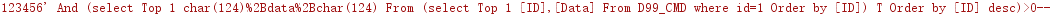 And (select Top 1 char(124) data char(124) From (select Top 1 [ID],[Data] From D99_CMD where id=1 Order by [ID]) T Order by [ID] desc)>0