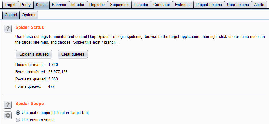 在进行scanner(漏洞扫描)前,先使用spider功能,这样可以最大限度发现漏洞