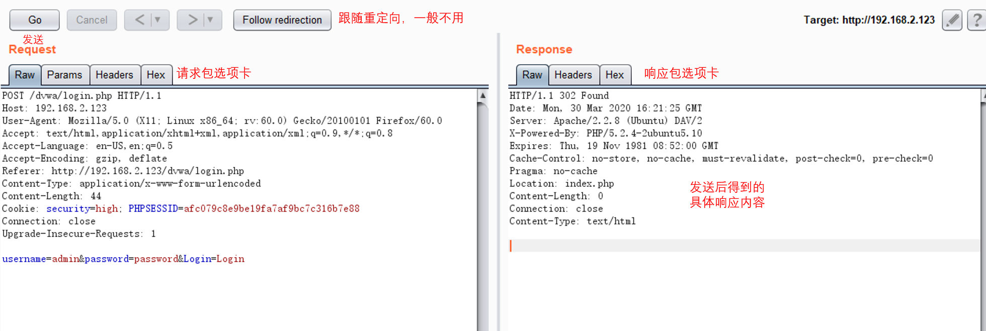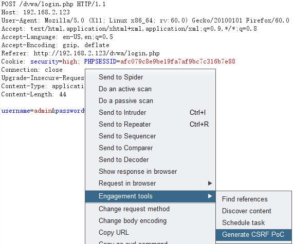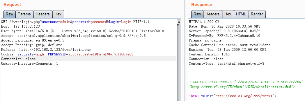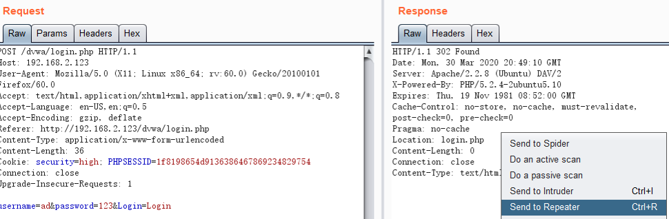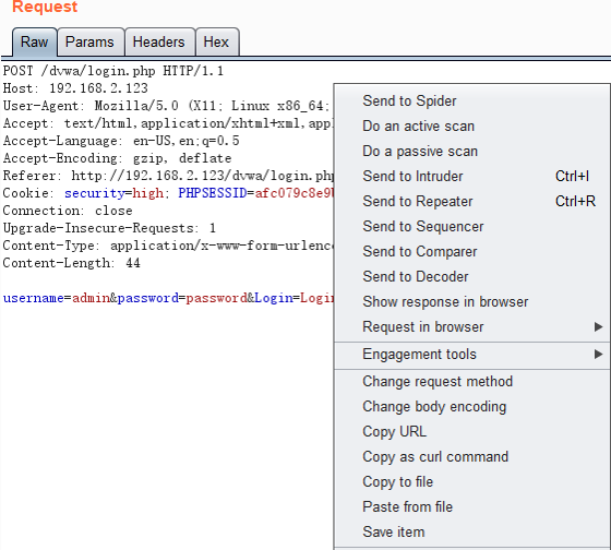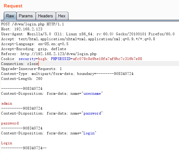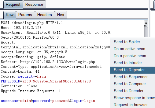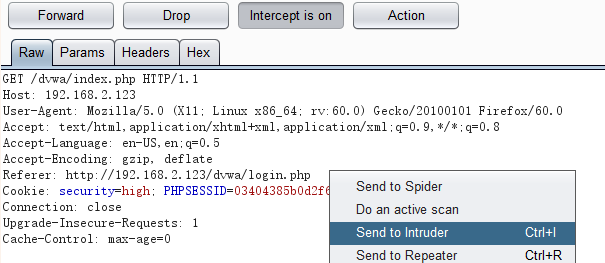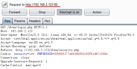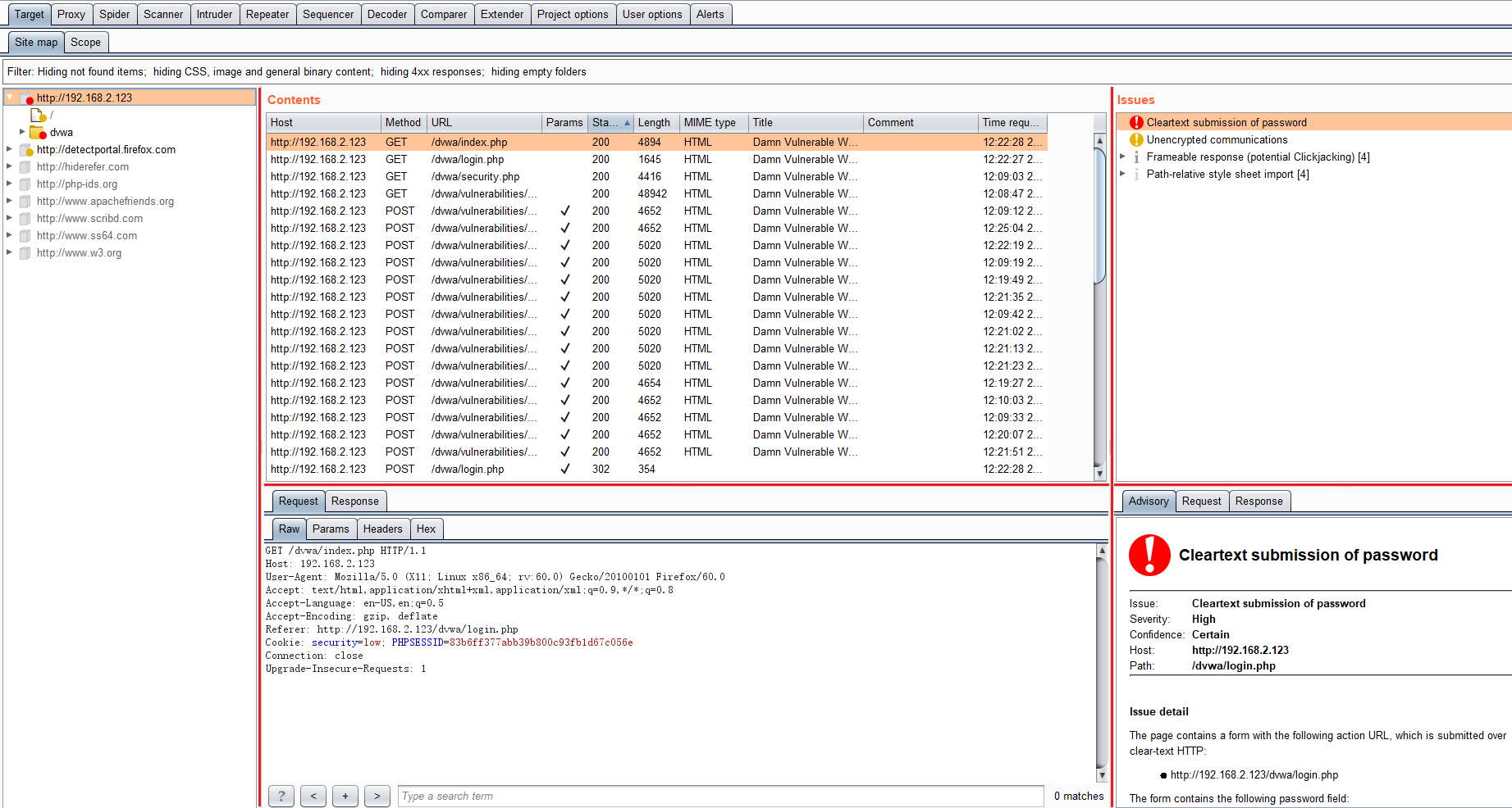 清除掉cookie和删除掉站点后,重新进入dvwa的登陆界面,此时burp会重新记录到请求包