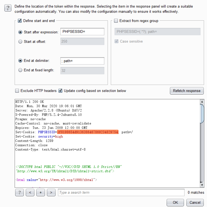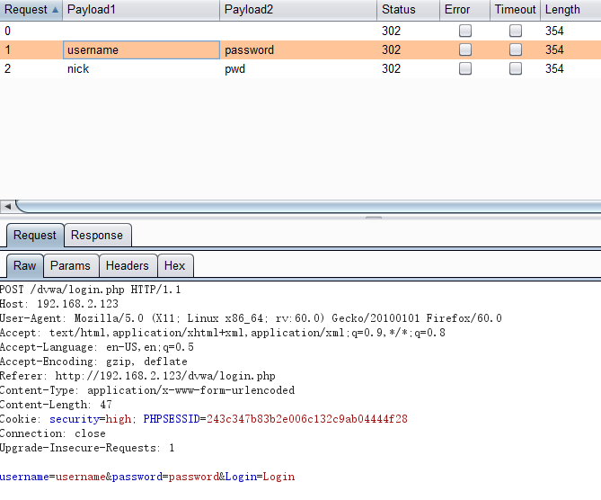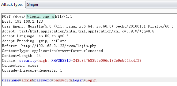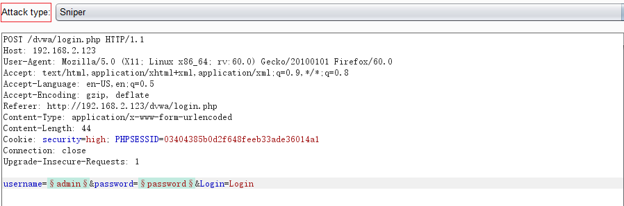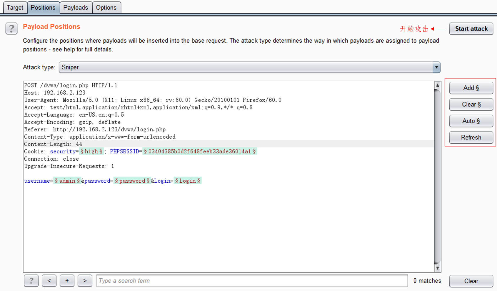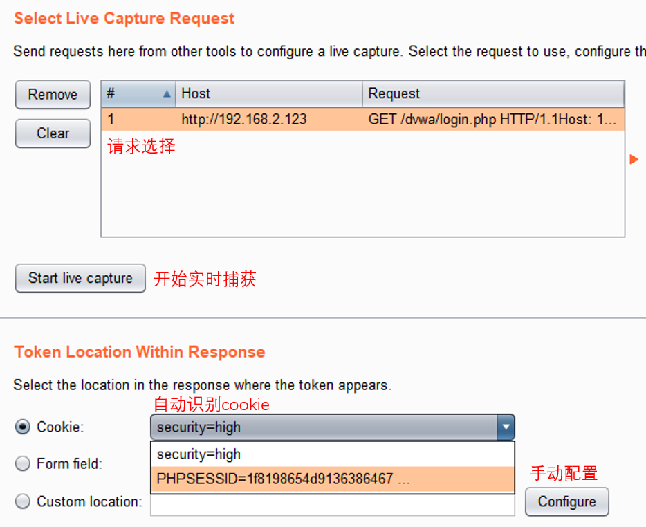 burp会自动识别可用的cookie,security是安全级别设置,不是我们要测试的,所以选择PHPSESSID。如果burp没有识别出来,点击手动配置