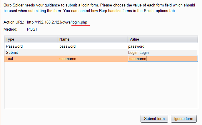 如果遇到需要验证的表单,burp会自动弹出,知道就填上,提交选Submit form,忽略选Ignore form