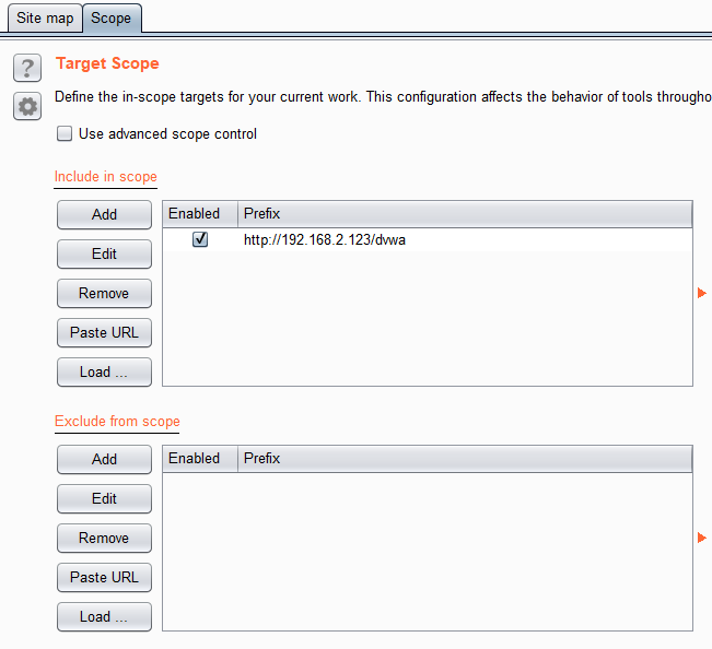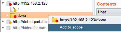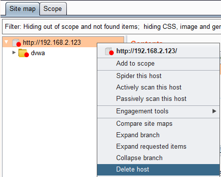 Target->site map来到站点地图后,选择dvwa站点后右键,delete host,选择yes删除