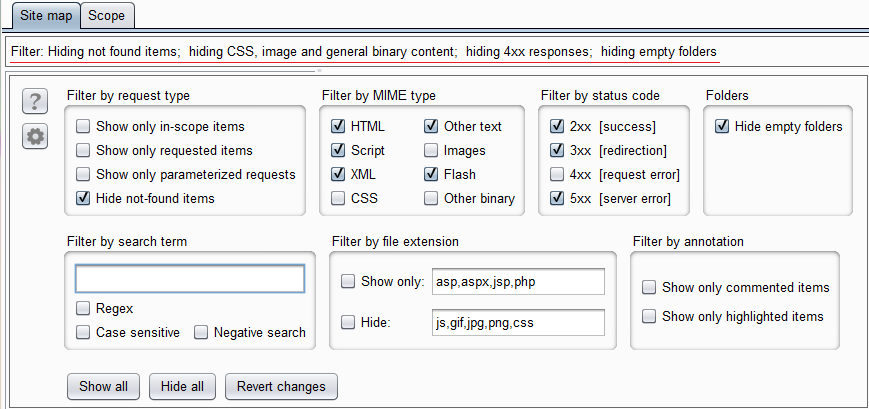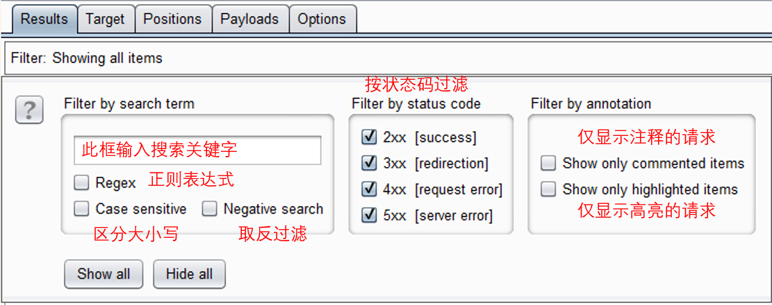 Show only parameterizend requests:仅显示参数化的请求 也就是 过滤掉html,htm这类站点