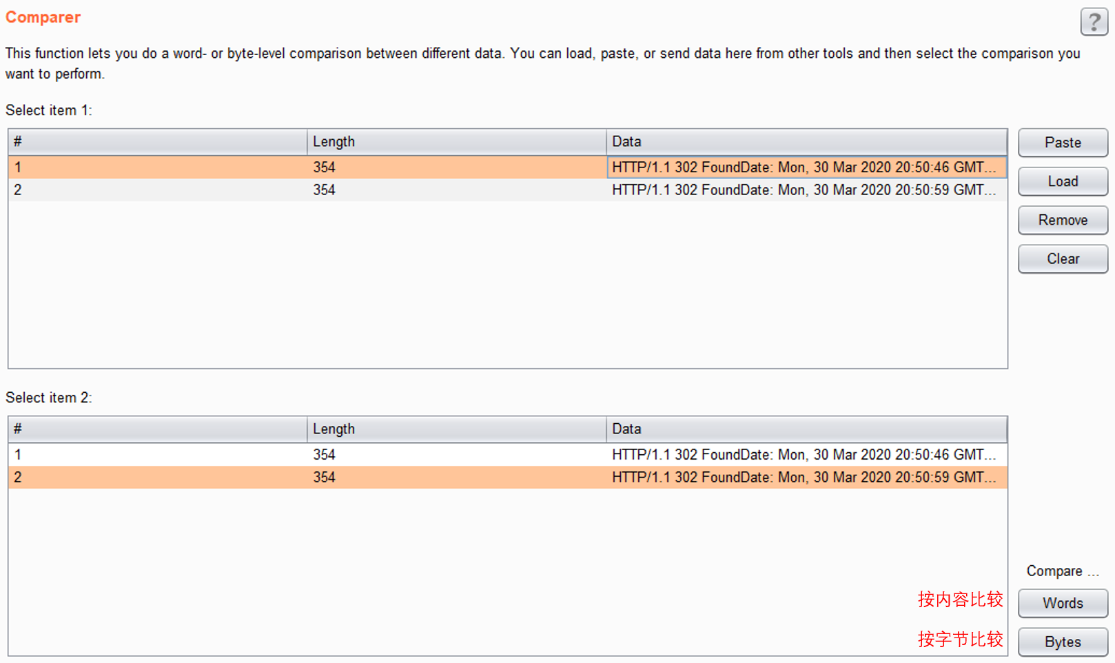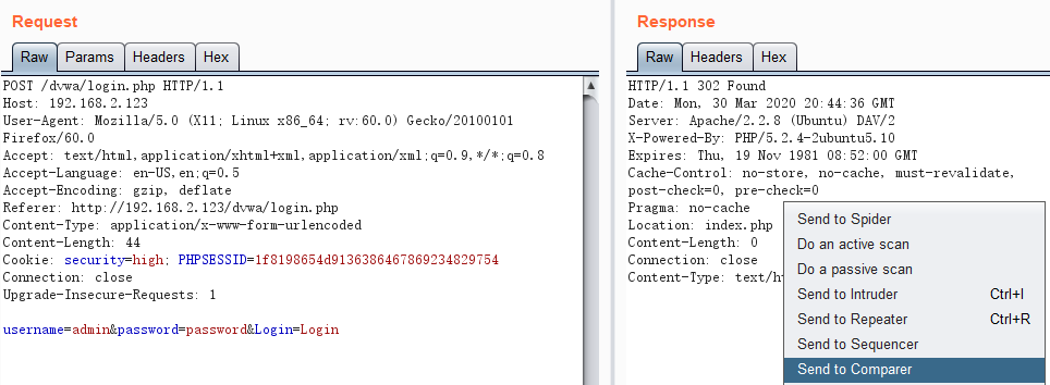 将dvwa中的登陆请求包发送进Repeater模块后,选择发送后,在响应包中右键send to Comparer,这次是正确的用户名和密码