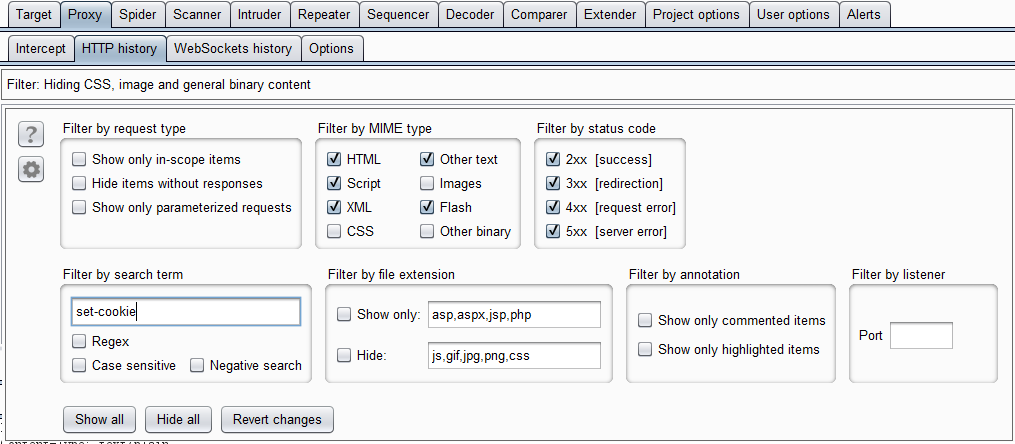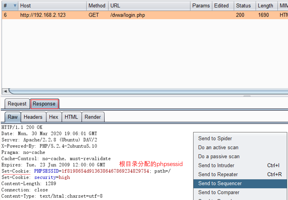 到Proxy->HTTP history可以看到历史请求,点击filter输入set-cookie,只看设置cookie的响应包过滤完后,找到响应包发送进sequencer