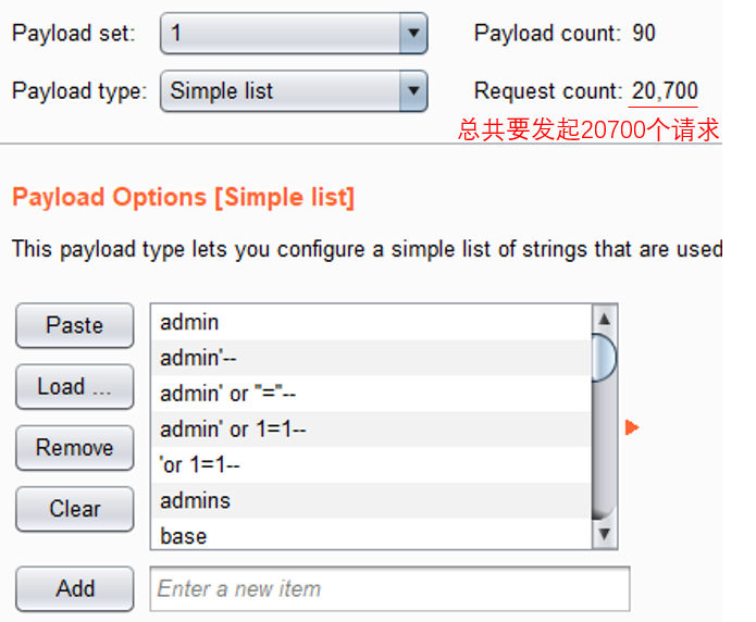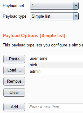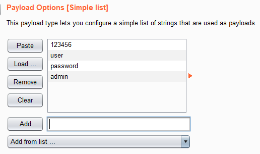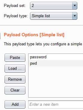 你可以手动添加内容,如上图所示,按回车或者点击Add。或者点击Load从文件中选择一个字典,或者选择burp内置的字典。