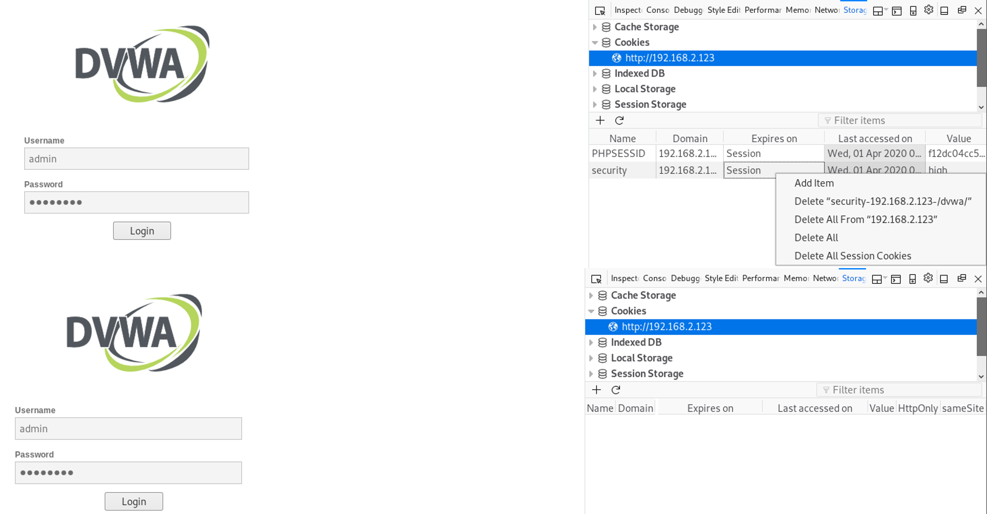 我这里是测试dvwa的seeion,所以先到登陆页面将cookie清除掉,选择Delete All后