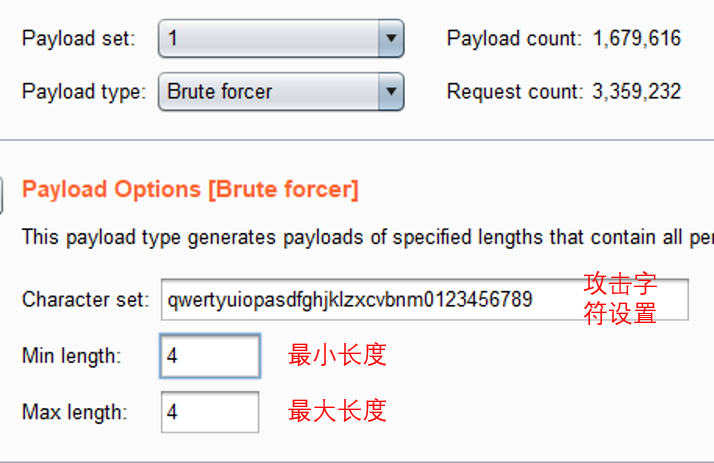 它是将最小字符到最大字符直接从攻击字符中随便挑选几个字符,比如我这里设置的是4个字符,那么它就会随便挑选4个字符,将所有情况都会尝试,是一种非常暴力的攻击,从图中可以看出有3359232种情况