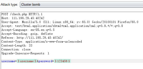 选择Cluster bomb攻击类型,设置好变量,配置payload