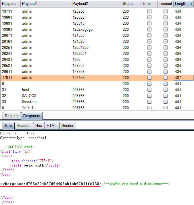 仔细看这独一无二的响应码437,其实一般爆破成功后,length一筛选马上就能发现那个秀儿,成功拿到flag