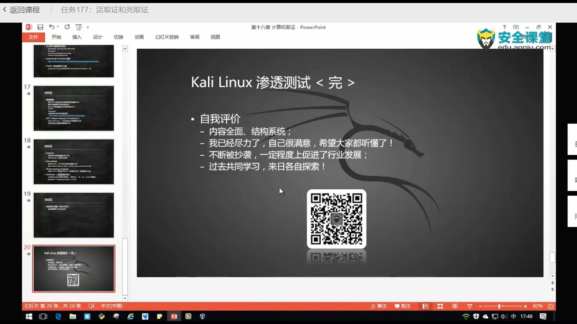 苑老师的这套质量非常高的渗透测试视频看完了,也了结我的一个心愿吧,从2019年左右就得到了此视频的资源,说到高考完后看,直到现在才咕咕咕咕的看完。视频的最后,还是苑老师那熟悉的结束语,“谢谢大家”,礼貌而又谦卑,让我心中还有点小小的不舍。最后,感谢苑老师的这套安全视频,完结撒花!